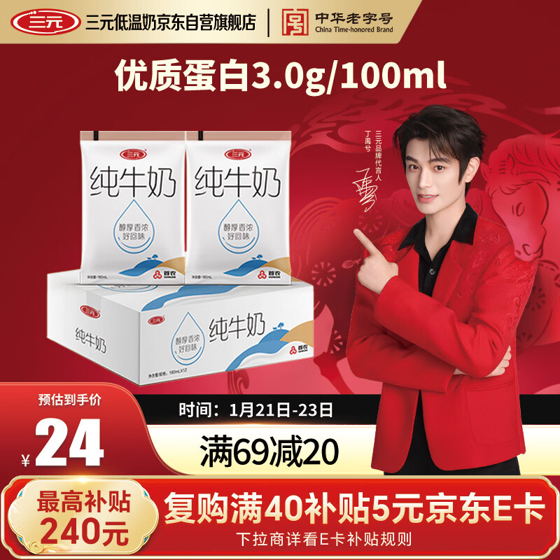 三yuan小白袋纯牛奶百利包180mL*12袋/箱