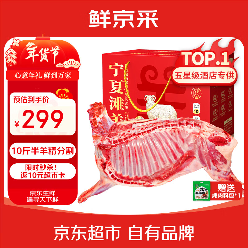 一一羊肉礼盒提前备一一 鲜京采 宁夏滩羊肉半只羊10斤 299自营包邮,