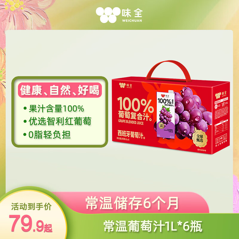 先领50-10补帖卷 味全 葡萄常温果汁1L*6盒 59.9亓自营包邮