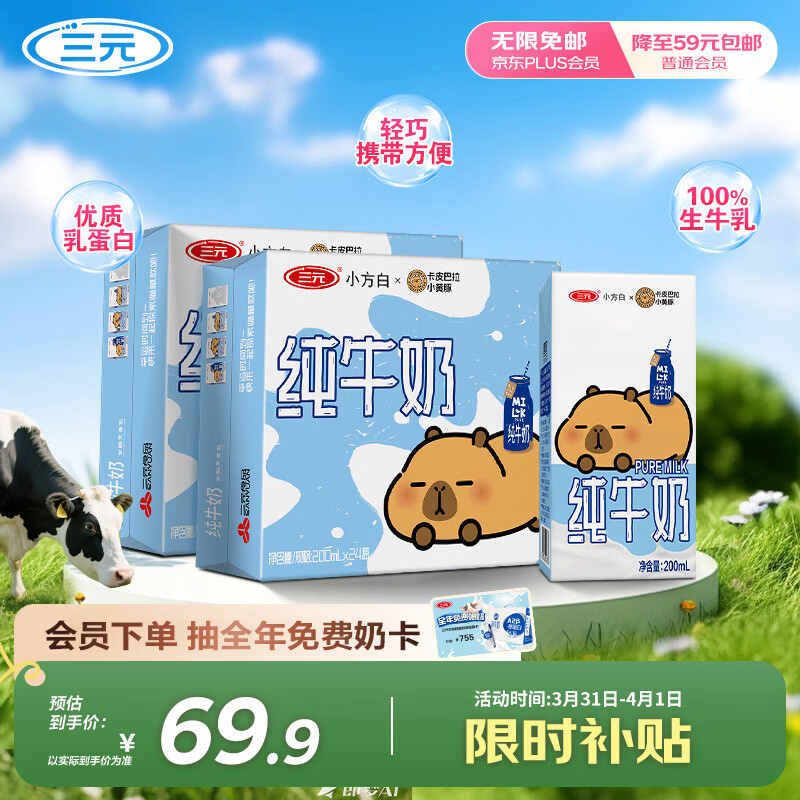 三元 小方白纯牛奶24盒*2箱 69.9亓自营包邮,折1.4亓/盒 *小