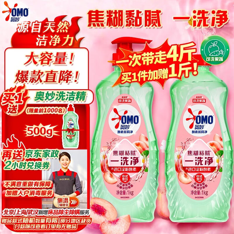 奥妙 餐具净洗洁精1kg*2瓶 69.9亓自营包邮,可洗果蔬 *赠同款洗