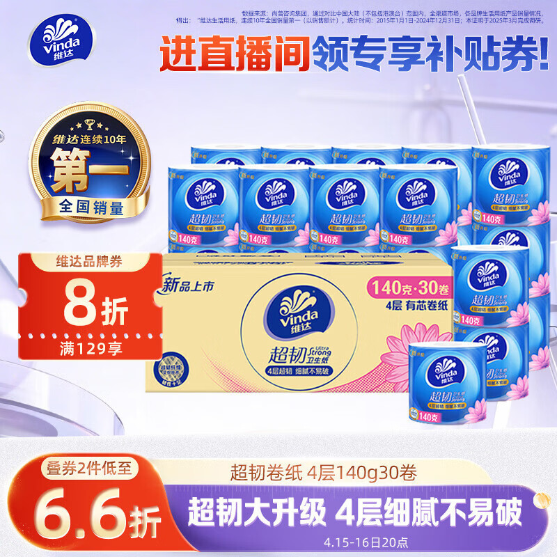 先领60打7.6折卷 【自营】超韧有芯卷纸140g*30卷 41.6亓