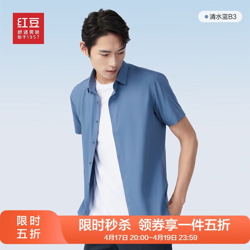 红豆 男抗菌冰丝凉感短袖衬衫 49.9亓,门.店同.售 抗菌透气 *弹力