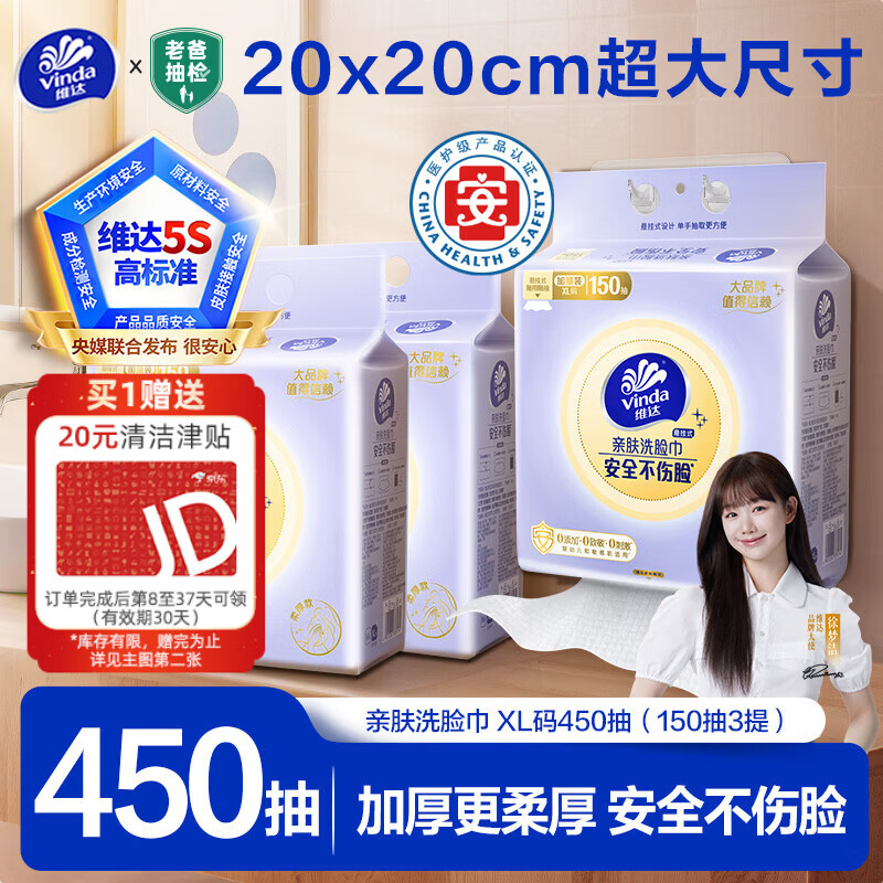 维达(Vinda)洗脸巾 150抽*3提XL码 悬挂式