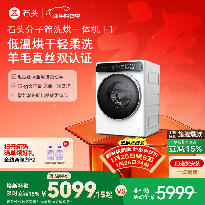 自辩 石头分子筛洗烘一体机H1 冰川白 12kg,以旧换新,國补后2790