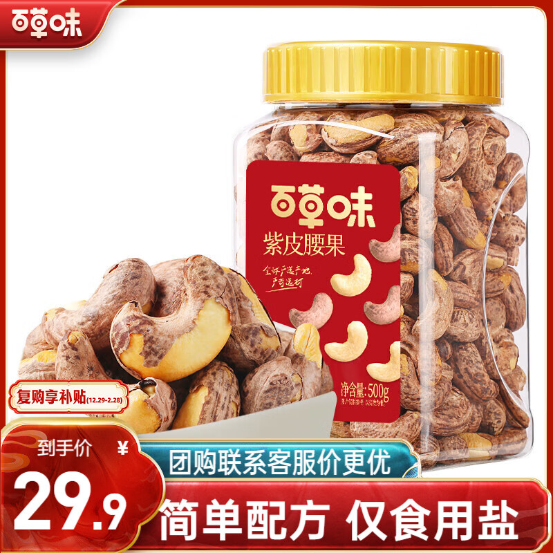 百草味 盐焗味紫皮腰果500g 29.9亓自营包邮,可拍多件 *A 大果