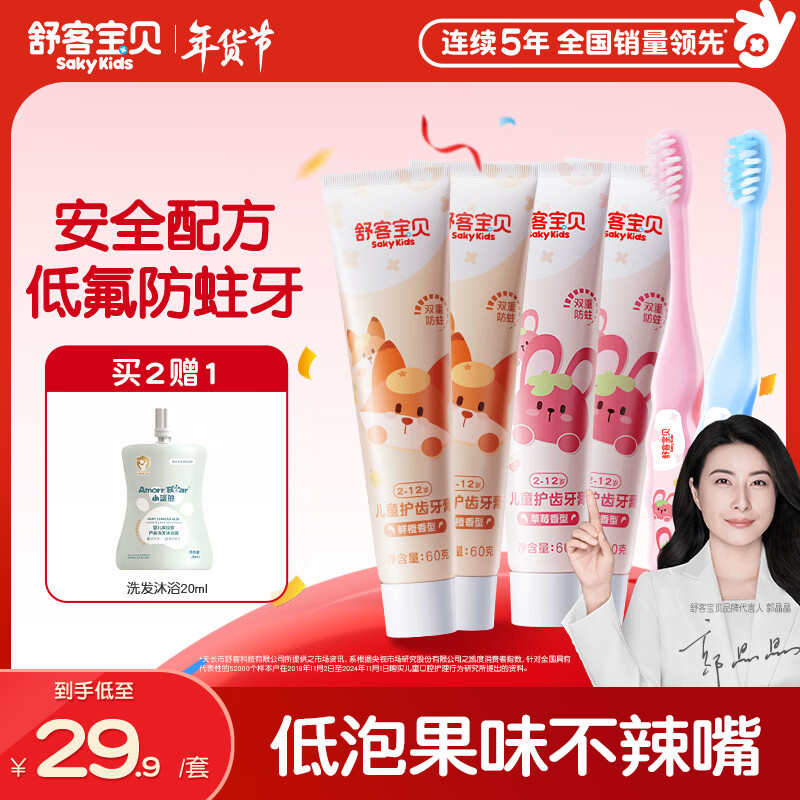 先领25-10卷 【自营】舒客 儿童防蛀套装 牙膏60g*4支 护齿牙刷