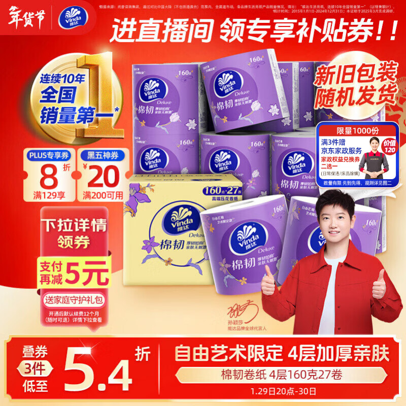先领2张补帖卷 【自营】棉韧卷纸160g*27卷 买3件117.2亓
