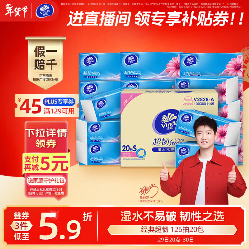 领129-40券 领 维达抽纸 超韧3层126抽*20包 叠首购拍