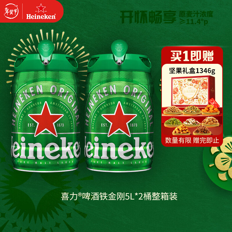 喜力 铁金刚啤酒桶装5L*2桶 220亓自营包邮,plus209亓 *赠