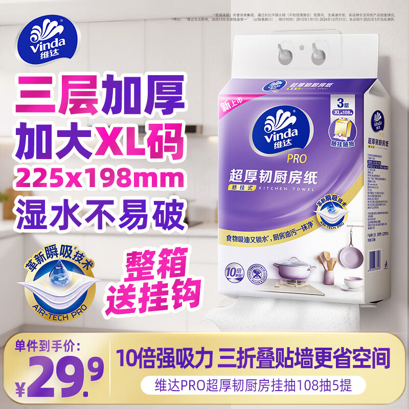 维达 厨房纸PRO超厚韧悬挂式抽纸3层108抽5提 3首单,凑后23.95