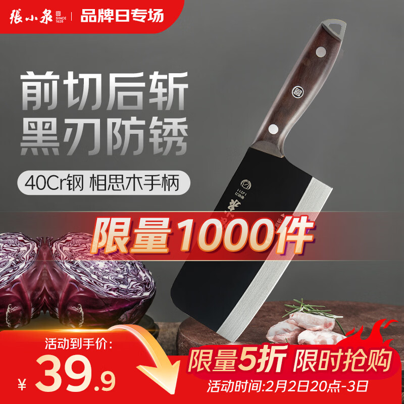 先领39-5卷 张小泉 黑将不锈钢菜刀斩切刀 34.9亓自营包邮,前切
