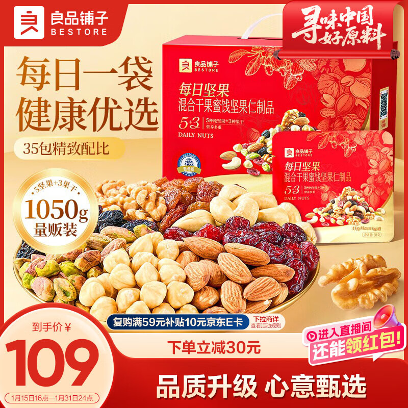 良品铺子 每日坚果礼盒1050g 89自营包邮,5坚果 3果干 *科学配