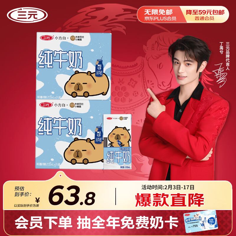 三元 小方白纯奶200ml*48盒 63.8亓自营包邮,折1.3亓/盒