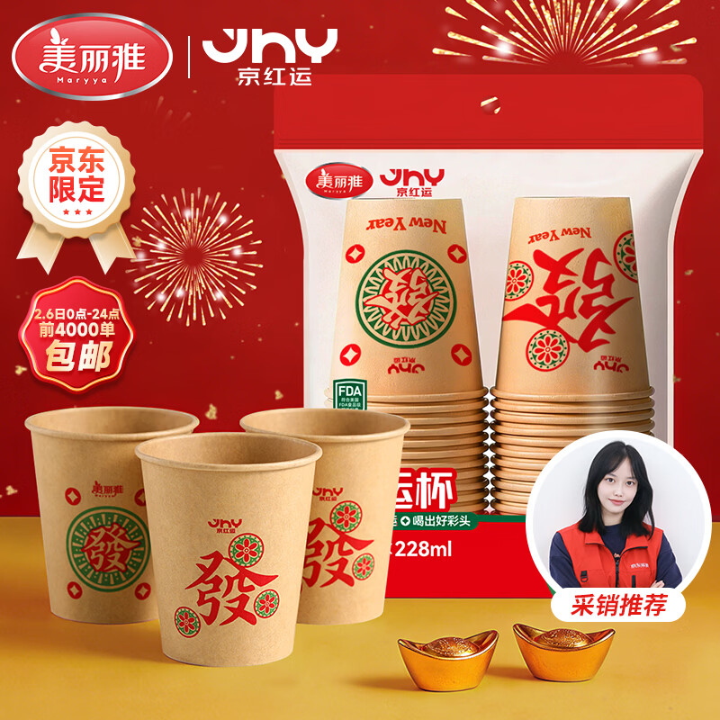 先领6.7补帖卷 美丽雅 马年红运發纸杯50只 买4件23.8亓包邮,