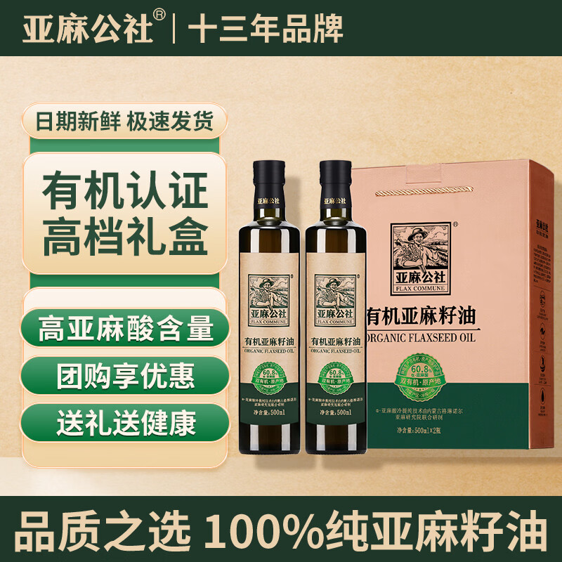 亚麻公社 亚麻籽油500ml*2瓶 99亓,礼盒包装 送礼力荐 *有机