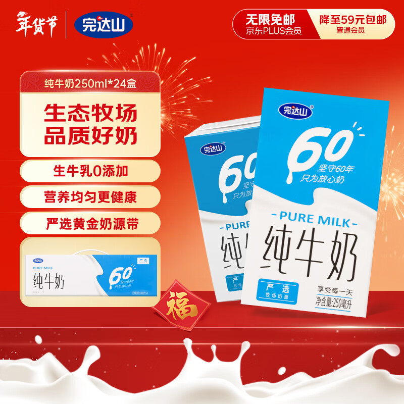 完达山 纯牛奶250ml*24盒 44.9亓自营包邮,折1.8/盒 *滴