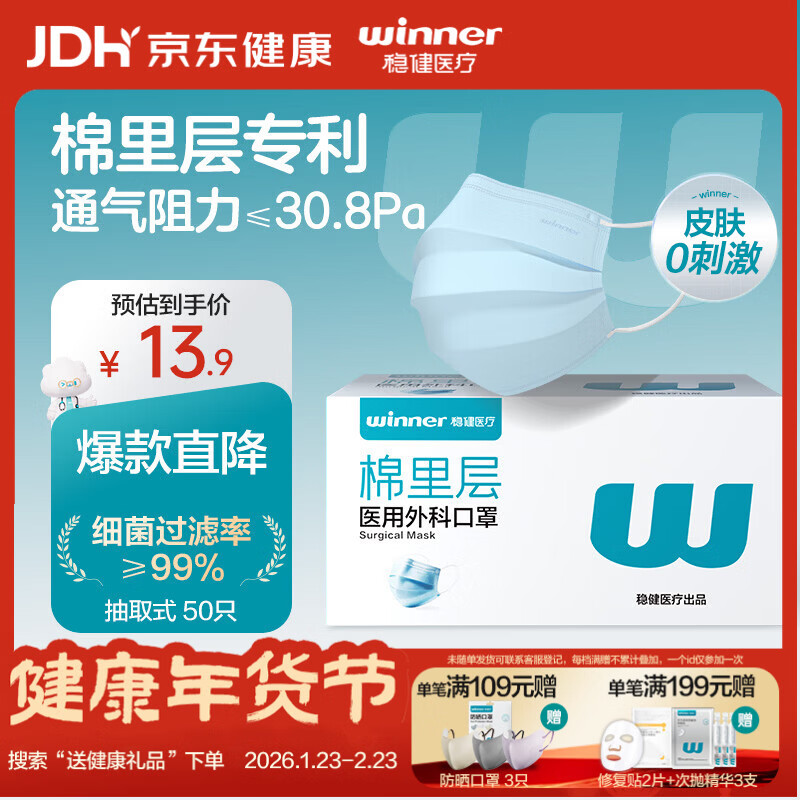 稳健一次性医用外科口罩50只/盒 砸10券,1首单2.2 支持200-