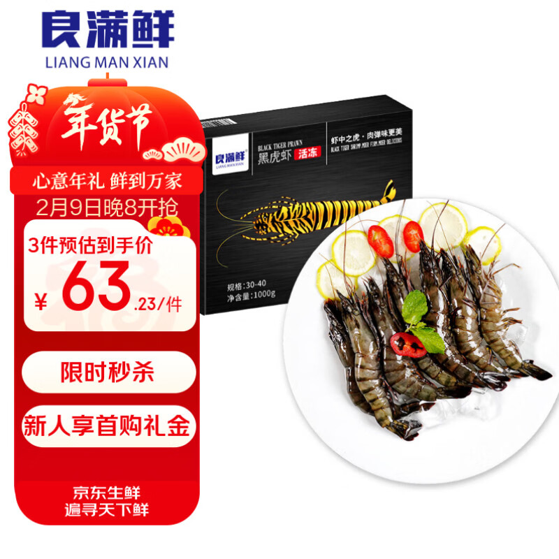 良满鲜 漳州大号黑虎虾净2斤 69.9亓自营包邮,新客减3亓 *3040