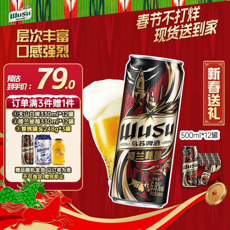 【自营】乌苏 楼兰秘酿 精酿啤酒500ml*12罐 买2件118.2亓,