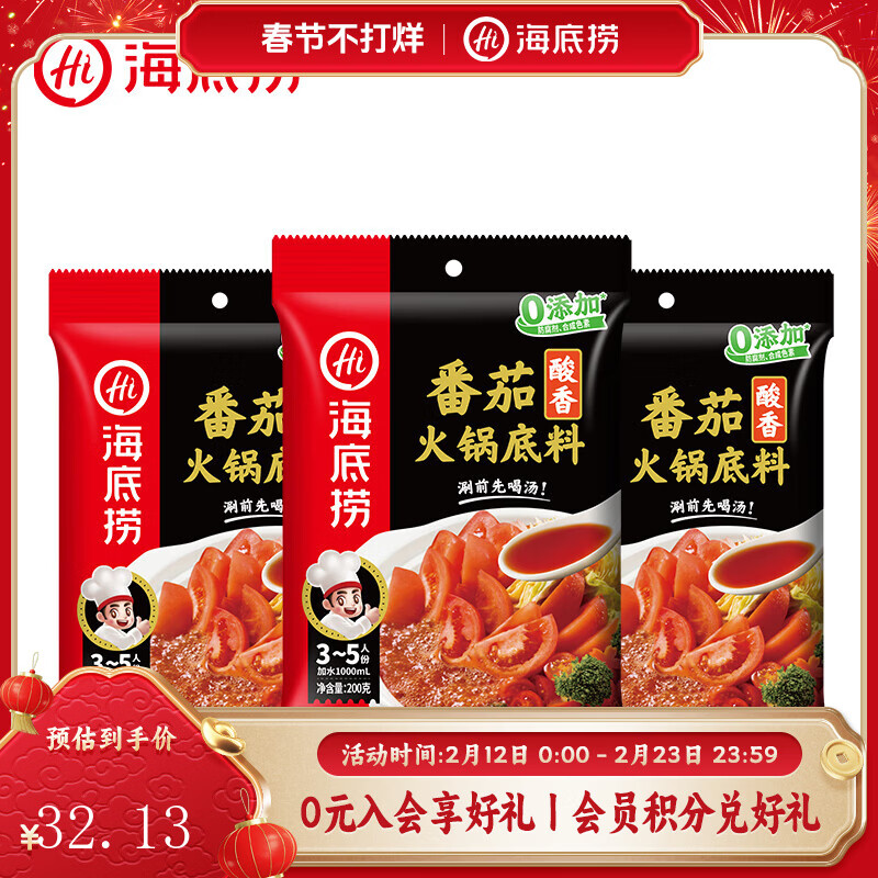 一一海底捞底料发車一一 先抢6元补贴券 1. 番茄火锅底料200g*3包