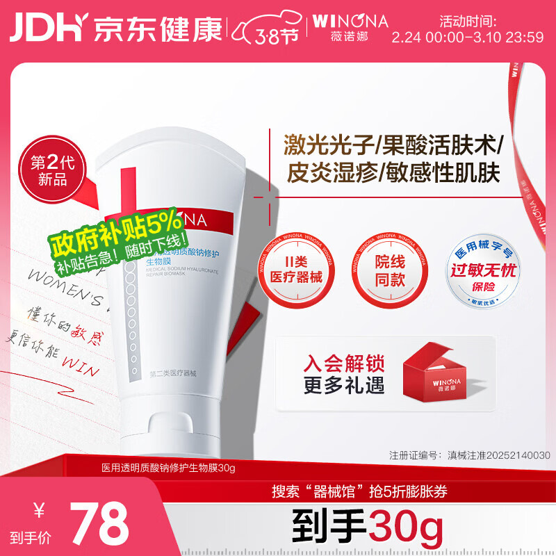 先领70-10补贴券 薇诺娜 透明质酸修护生物膜30g 选银行卡支付6