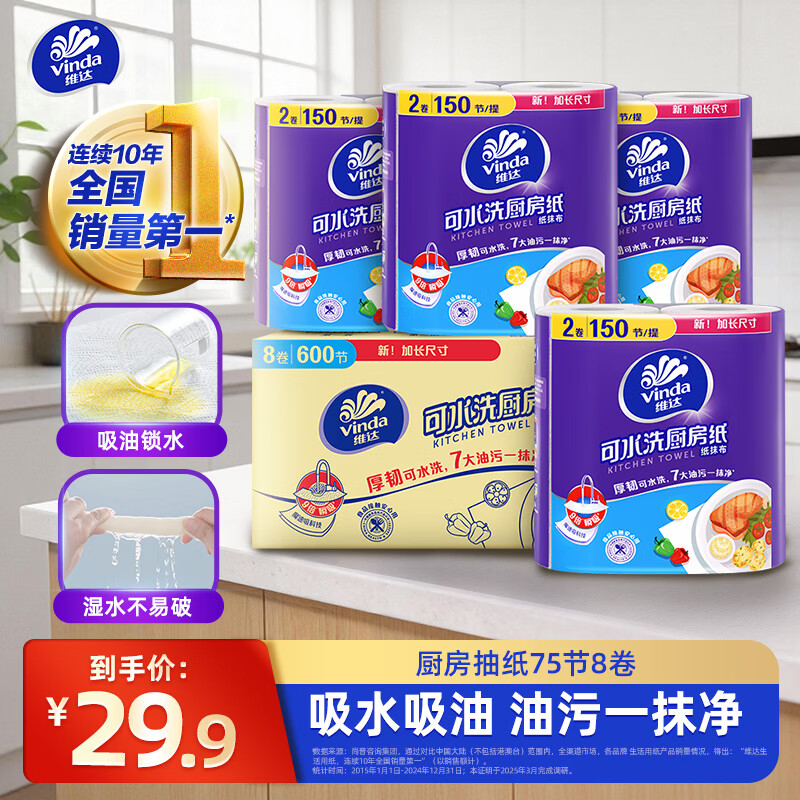 先领59-10补贴券 维达 家用厨房卷纸75节*8卷 买2件49.8亓