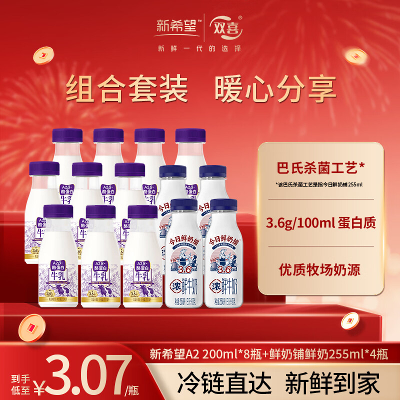 新希望 低温鲜牛奶组合装12瓶 36.9亓自营包邮,才折3亓/瓶 *冷链