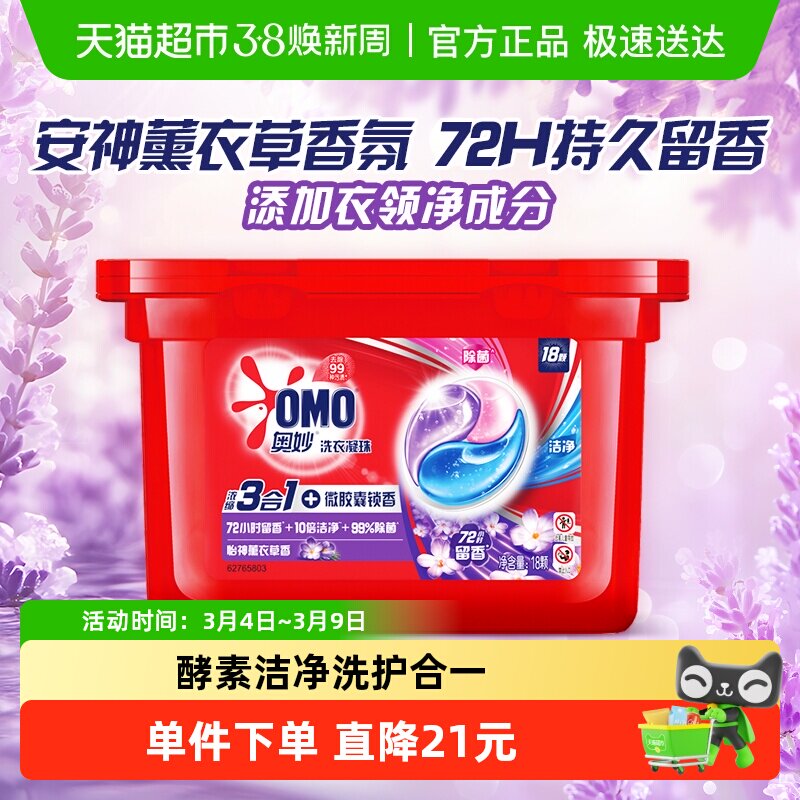 奥妙3合1洗衣凝珠薰衣草香18颗,淘金币页面加购,到手7.95