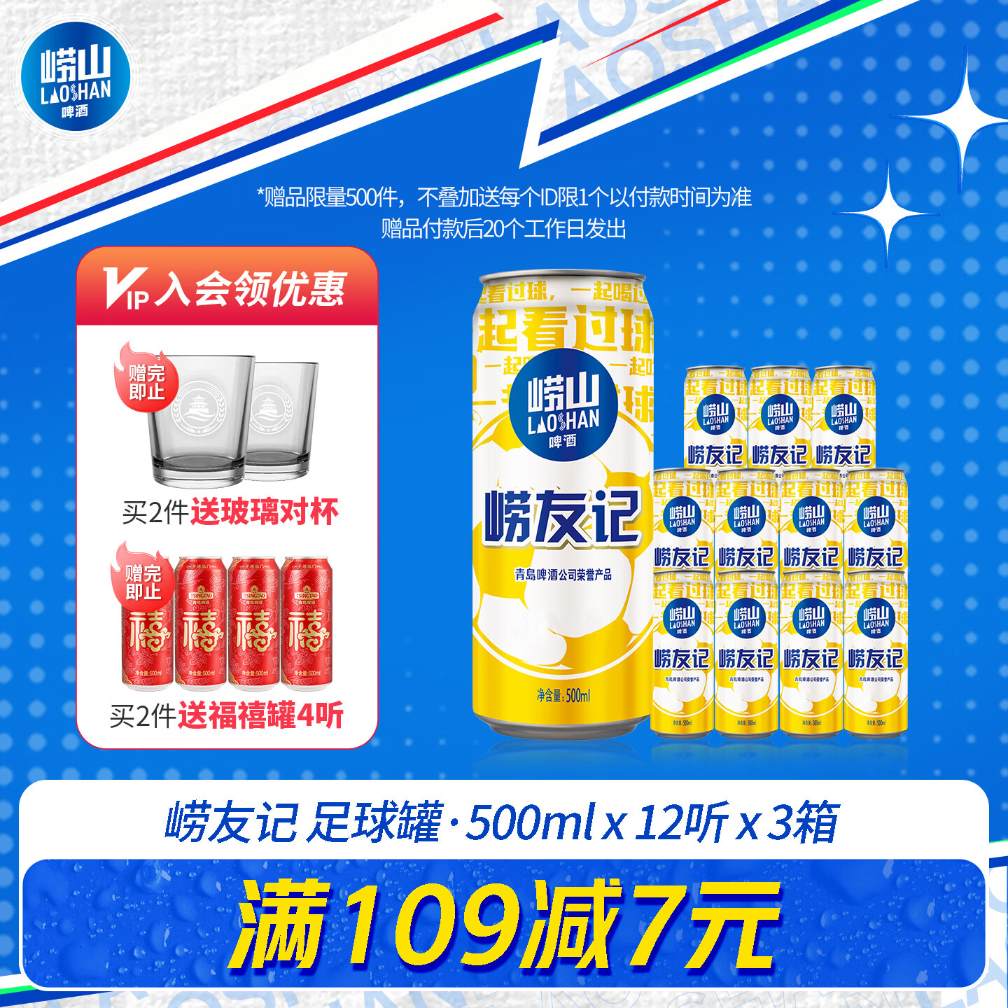 崂山啤酒 足球罐500ml*36听 93亓,折2.58/罐 好喝划.算