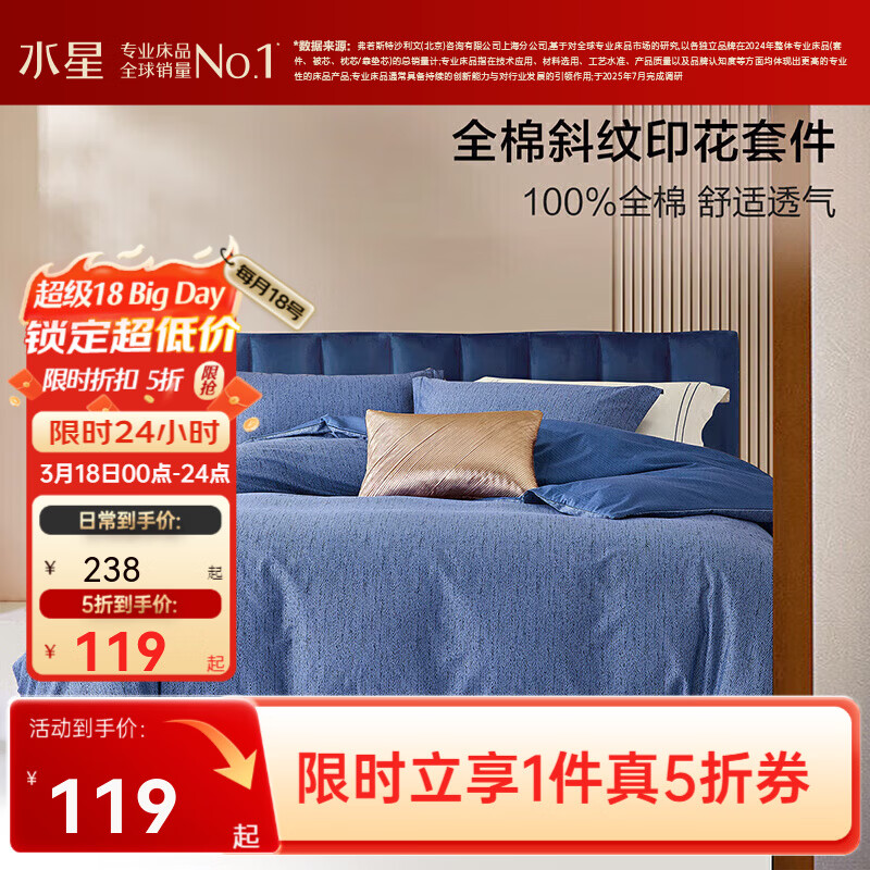 水星家纺床品合集 领2张5折券 纯棉印花四件套 119亓 全棉