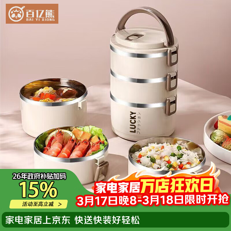 先领5折补帖卷 百乙熊 316L不锈钢4层装饭盒 14.5亓,新客到手