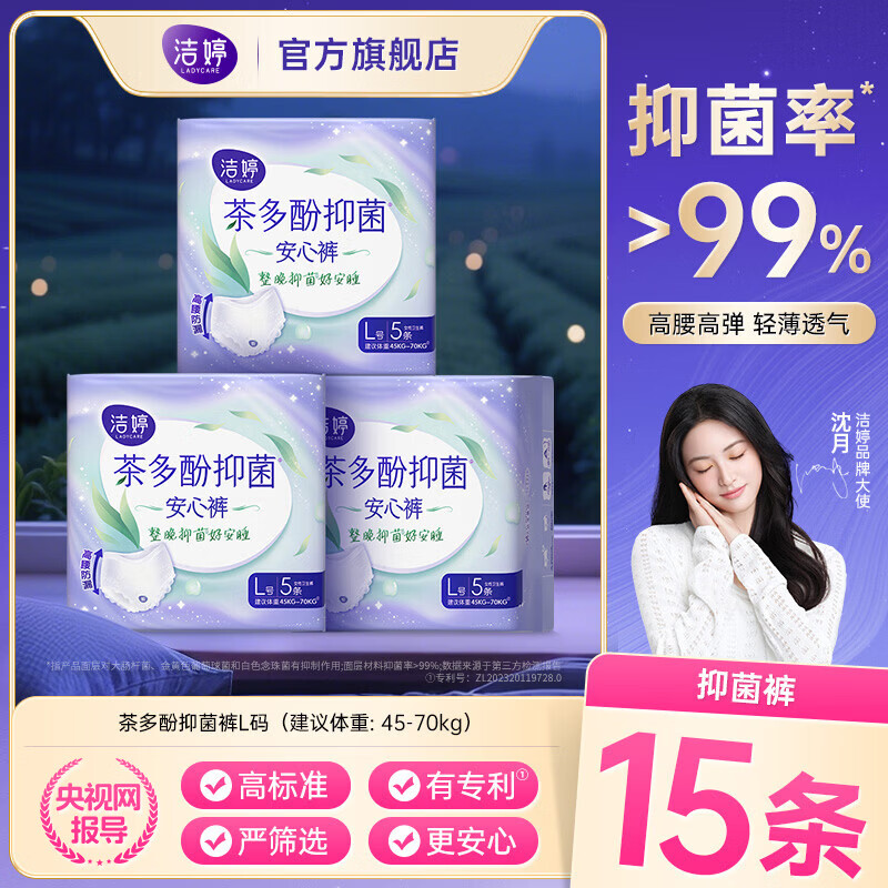 洁婷 茶多酚抑菌夜安裤15条 领 拍 18.9亓,高腰高弹 整晚好眠