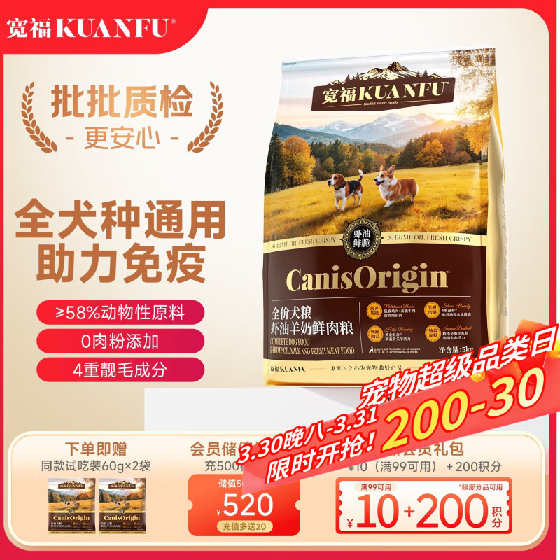 宽福虾油羊奶鲜肉狗粮5kg*1袋 32首单,凑后31.66 凑2件
